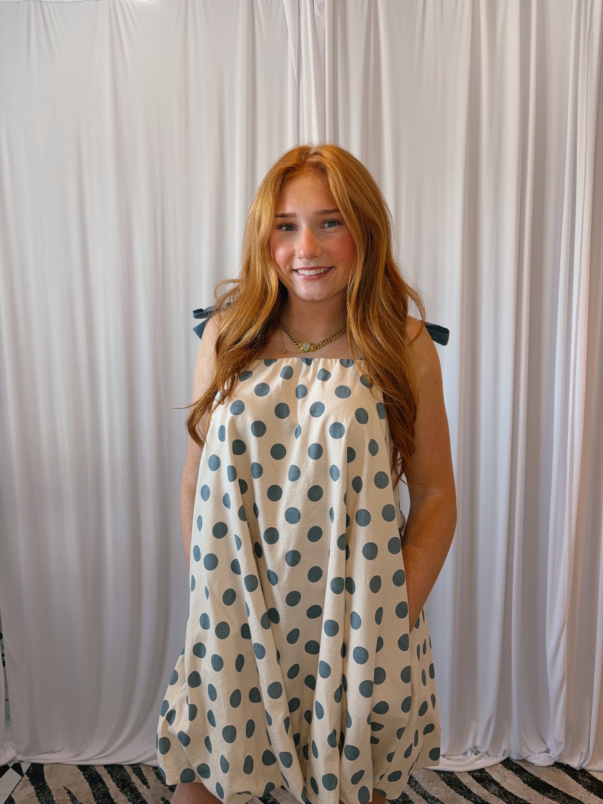Twirl in style with this charming blue polka dot dress! Featuring adjustable bow straps that let you customize your fit and a fun bubble bottom hem that adds a flirty bounce to every step. Perfect for playdates, parties, or just because—this dress combines comfort with adorable details that'll have everyone asking where you got it. A wardrobe essential that's as sweet as it is stylish!