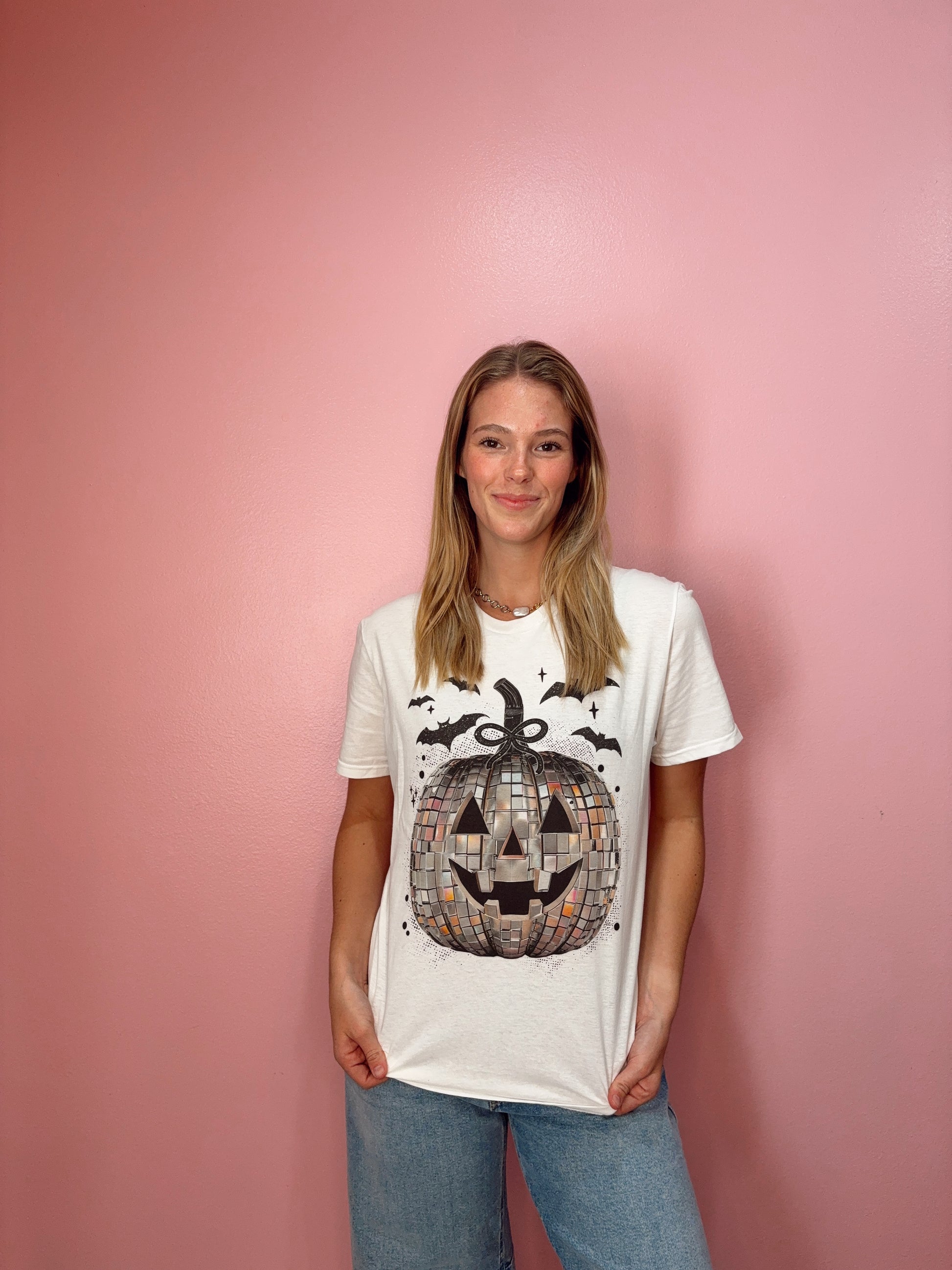 Celebrate Halloween in style with the Disco Jack O Lantern Halloween Graphic Tee. Crafted from high-quality fabric, this tee offers both comfort and durability. Its charming, festive design makes it the perfect choice to showcase your Halloween spirit while staying effortlessly cute. Ideal for parties or casual wear, this shirt blends fun and fashion for a standout seasonal look.