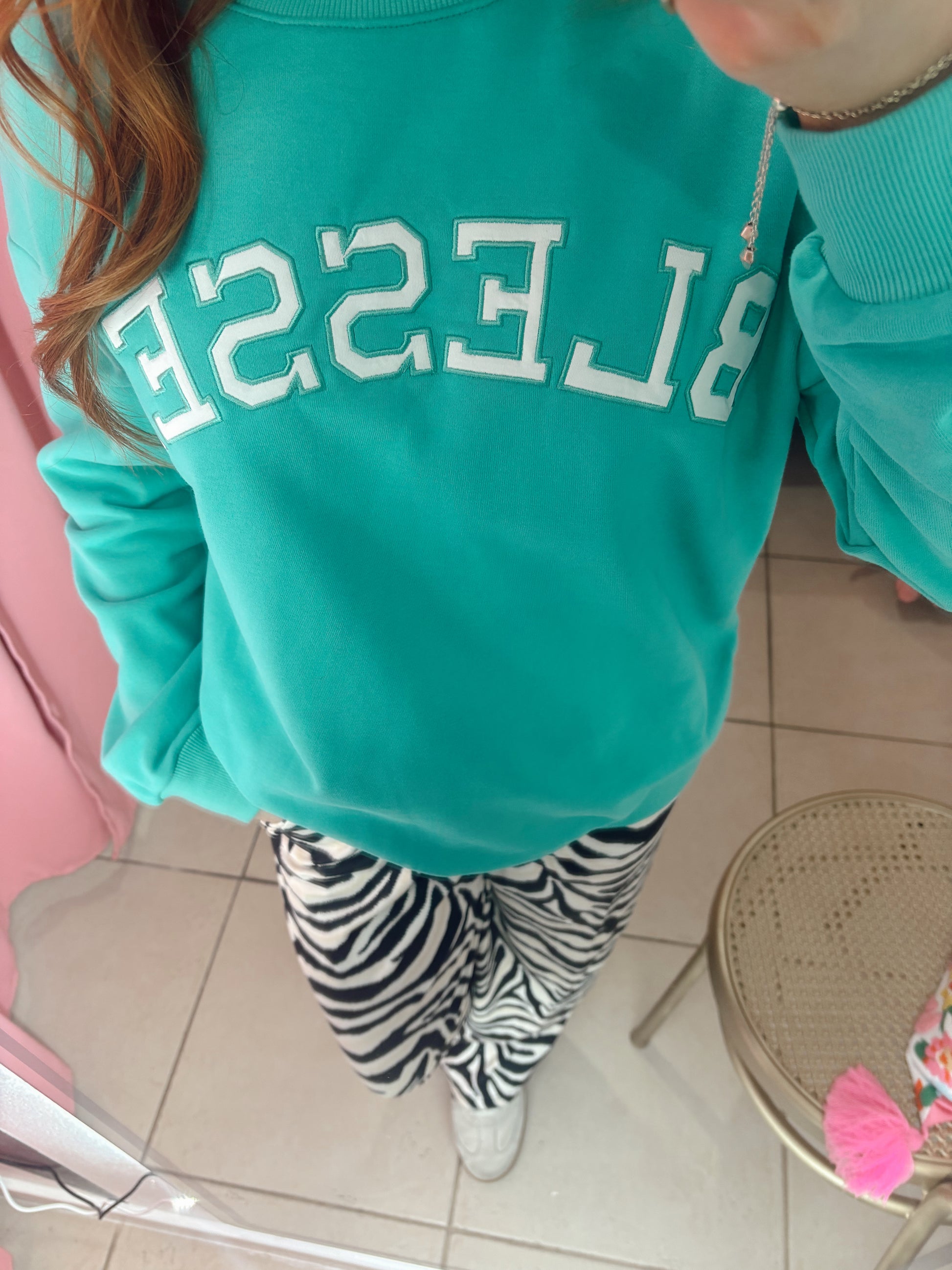 Wrap yourself in cozy comfort with this adorable embroidered mock neck sweatshirt. Featuring a sweet "Blessed" design, it's the perfect blend of style and softness for everyday wear. Whether you're lounging at home or running errands, this quality piece keeps you feeling cute and confident. The classic mock neck silhouette pairs effortlessly with your favorite jeans or leggings, making it a go-to staple for any season. Snuggle up in something that feels as good as it looks!