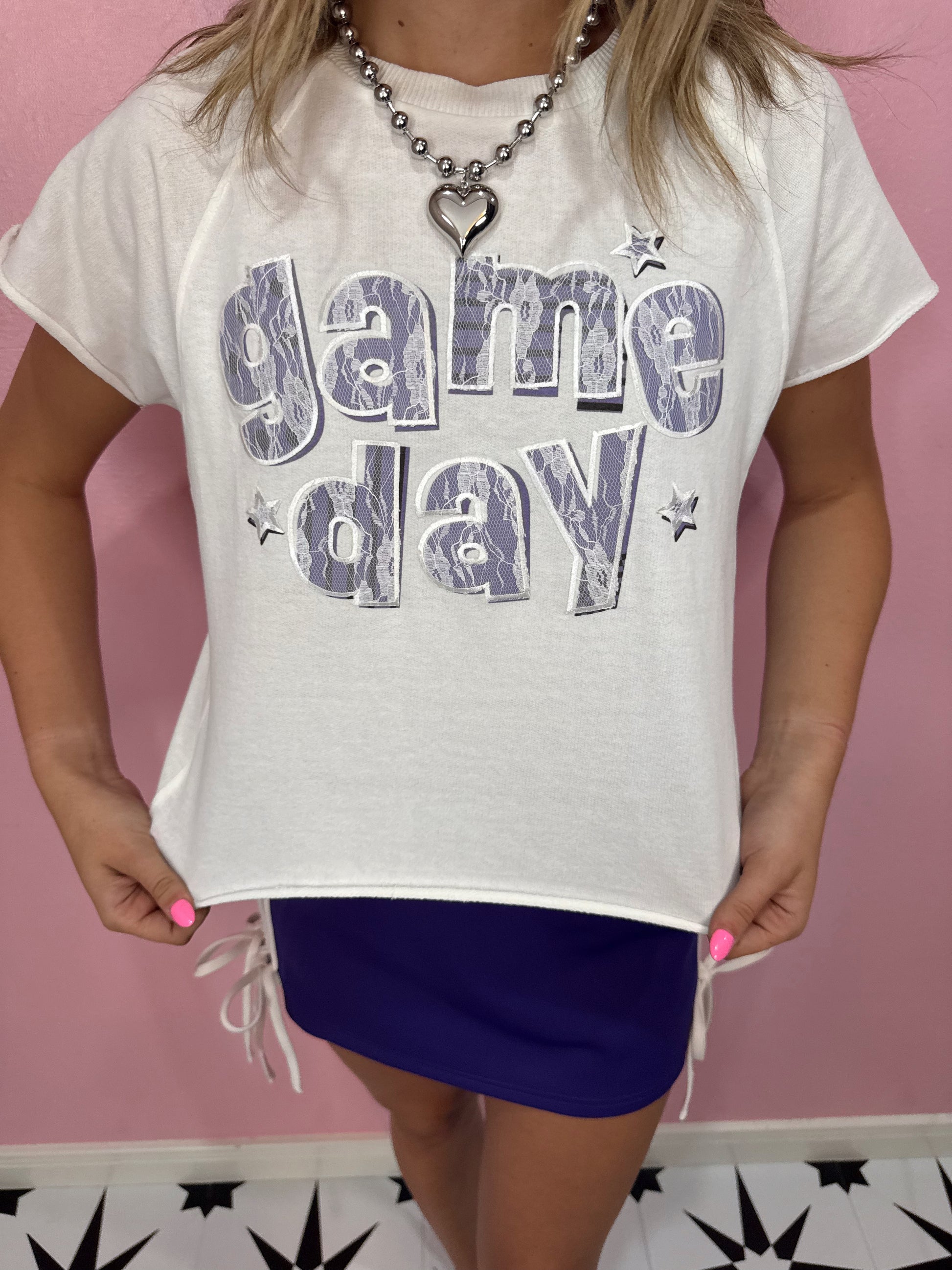 Stay comfortable and stylish with the Lace Game Day Tee, a lightweight graphic tee designed for a relaxed, breathable fit. Crafted without fleece, this tee offers a soft, airy feel perfect for layering or wearing on its own. Sized up for a longer, flattering cropped look, it’s ideal for game day or casual outings. Elevate your wardrobe with this effortlessly cool piece that combines comfort and trend in one.