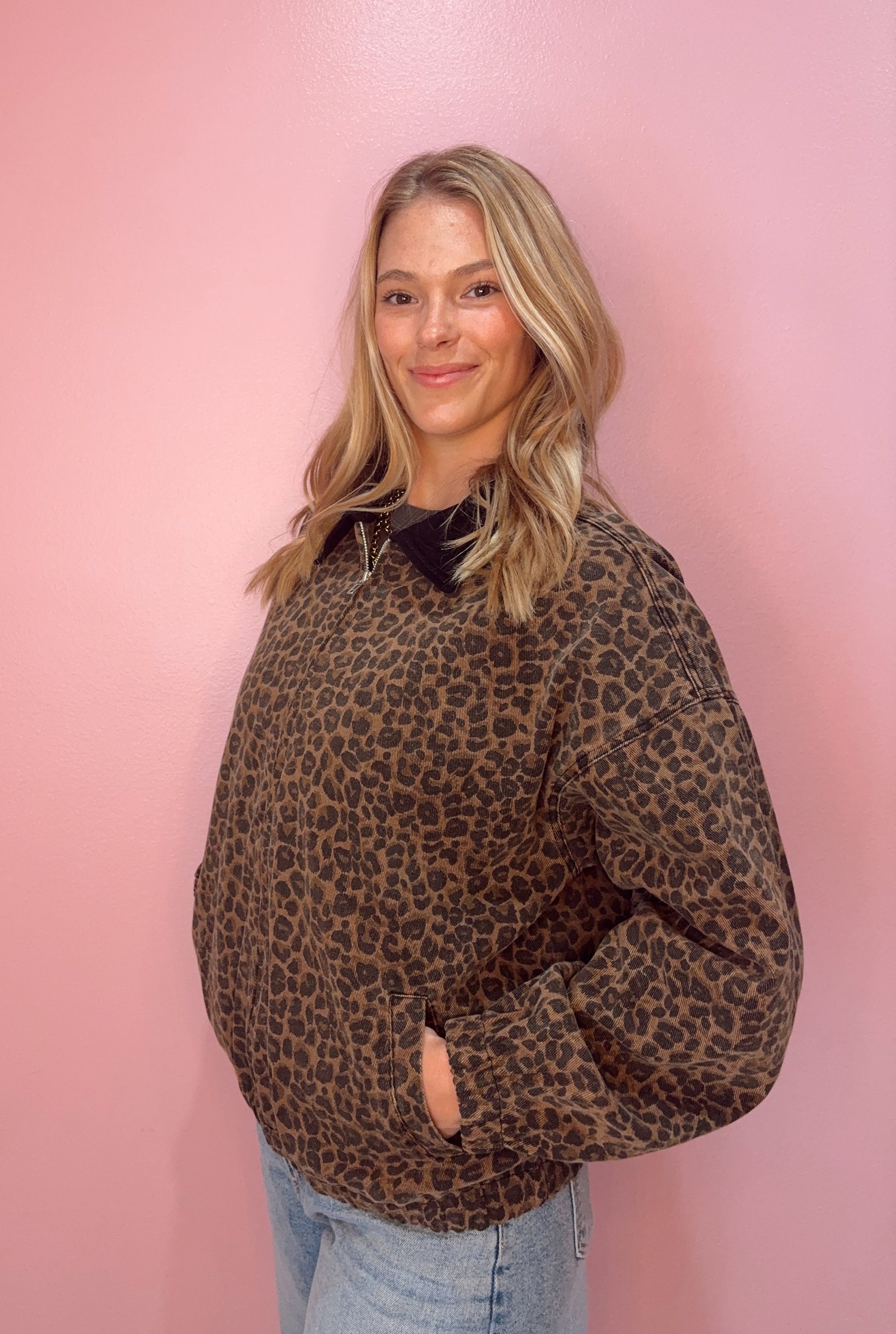 Elevate your wardrobe with this Leopard Print Oversized Jacket, designed to combine bold style with comfort. Its roomy fit allows effortless layering while highlighting your silhouette with a trendy animal print. Perfect for adding a fierce edge to any outfit, this jacket complements various looks from casual to chic. Modeled here in size small to showcase its flattering oversized shape on a 5'8" frame with bust 32B, waist 24", and hips