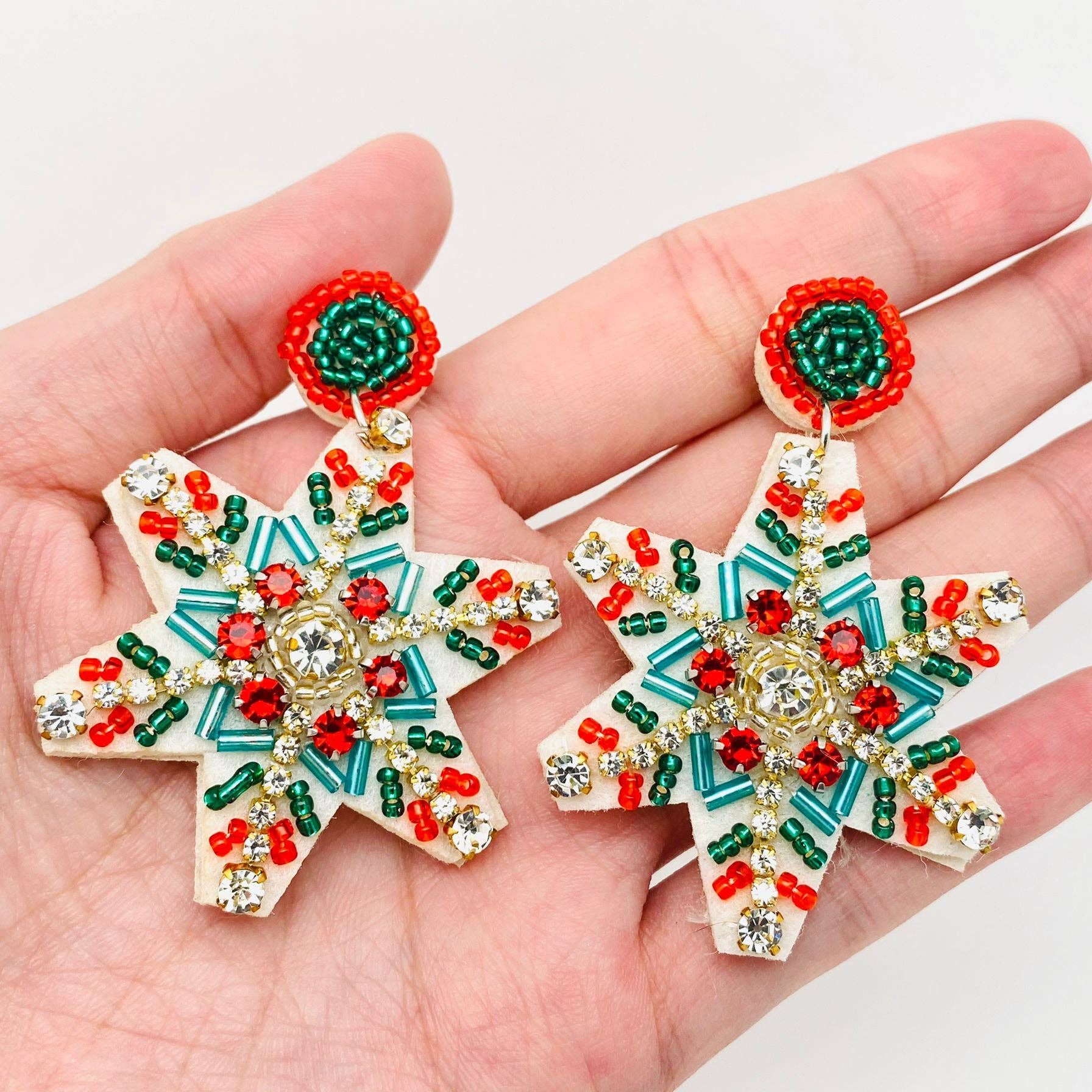 Mio Queena - Christmas Rhinestone Colored Beaded Snowflake Post Earrings