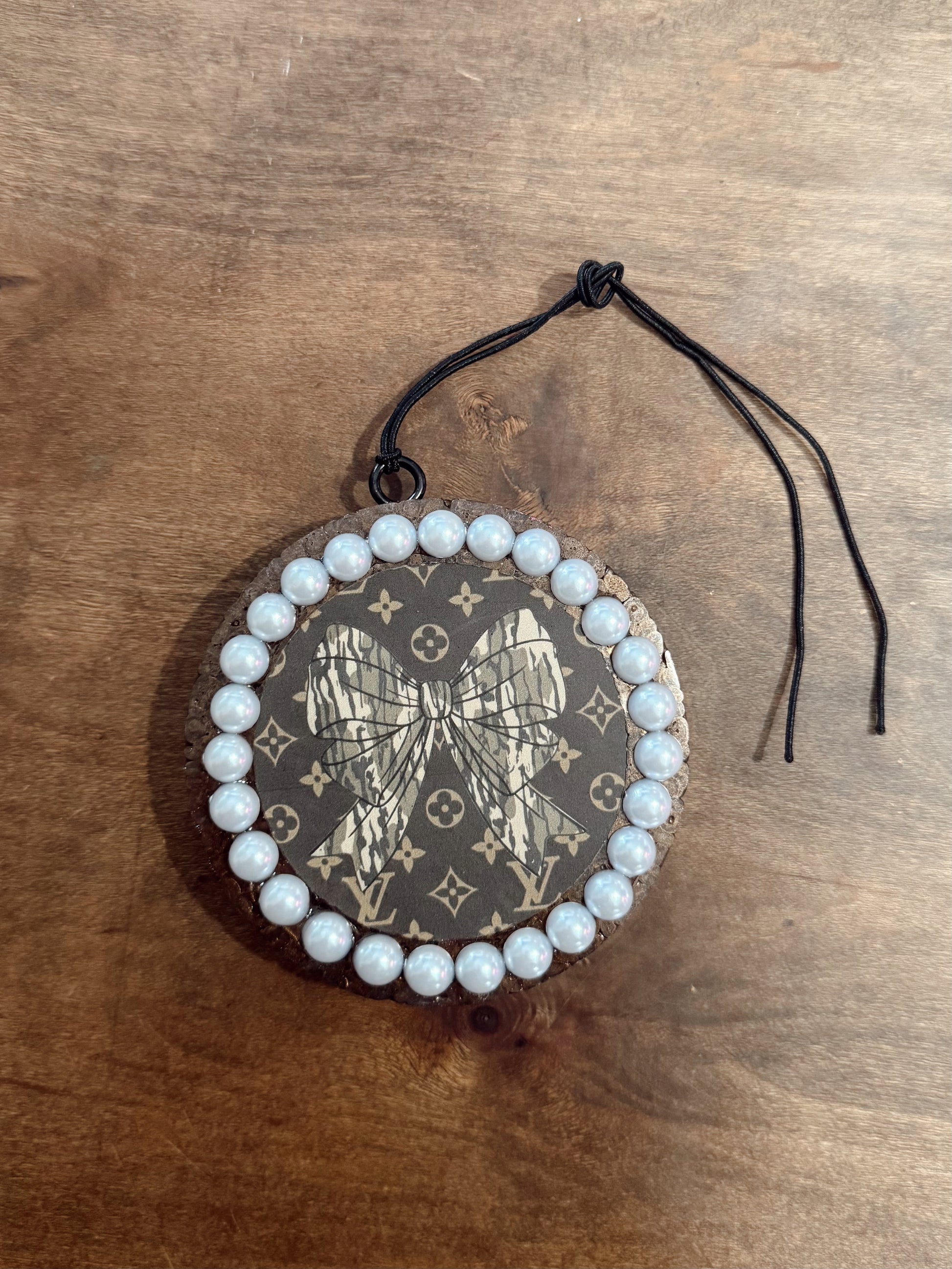 Elevate your car's fragrance game with this stunning Pearl Camo Bow Freshie. Crafted from premium cardstock, this design features a bold camouflage pattern beautifully outlined in lustrous pearls that catch the light with every glance. The elegant bow detail adds a touch of sophistication to your vehicle's interior.