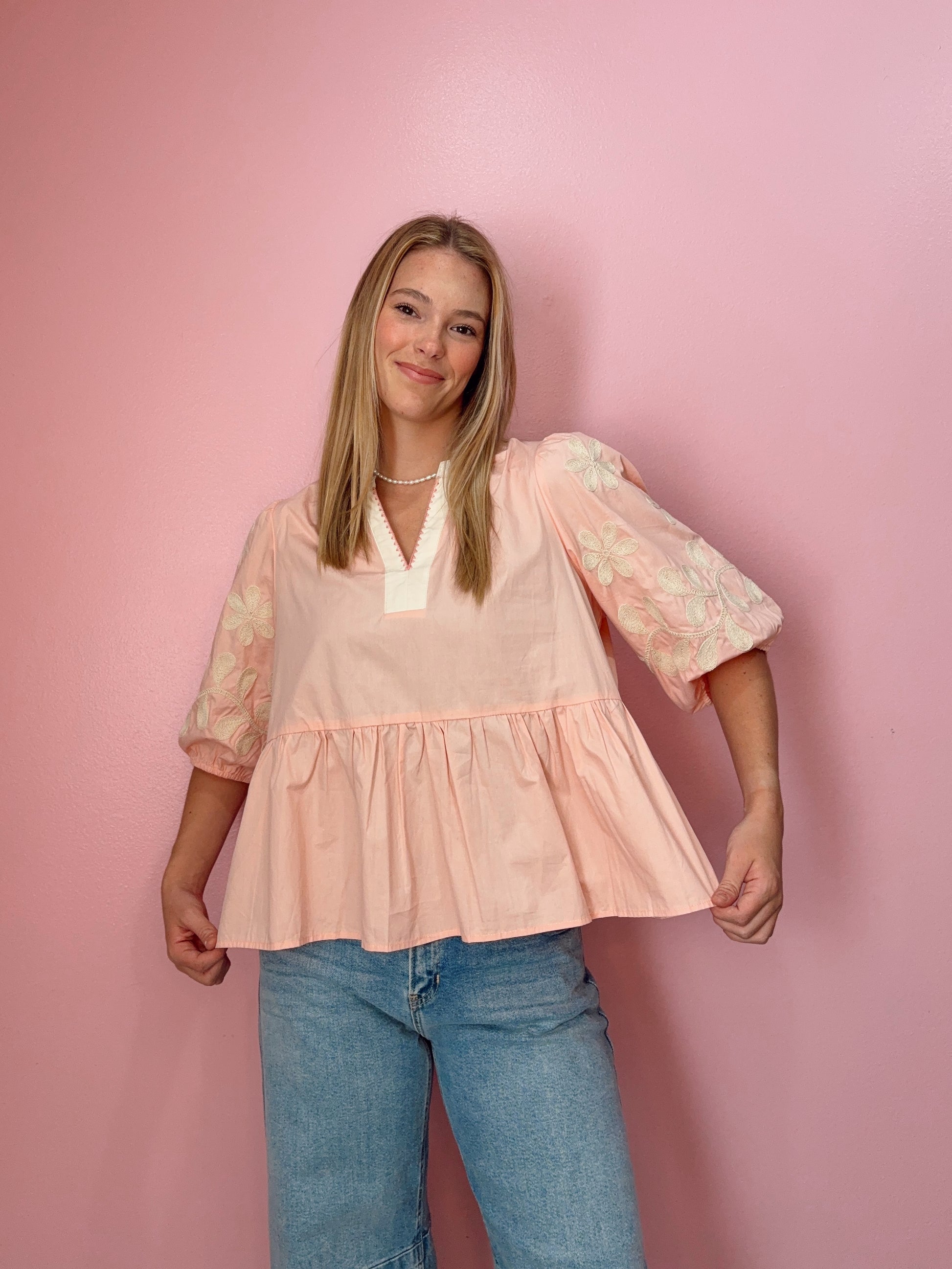 Fall in love with our Pink Embroidered Babydoll Top! This solid top features beautifully embroidered ¾ puff sleeves that add a touch of elegance to your wardrobe. Made of lightweight, non-sheer woven fabric, this pullover top is perfect for any occasion. Feel confident and stylish in our stunning babydoll top!