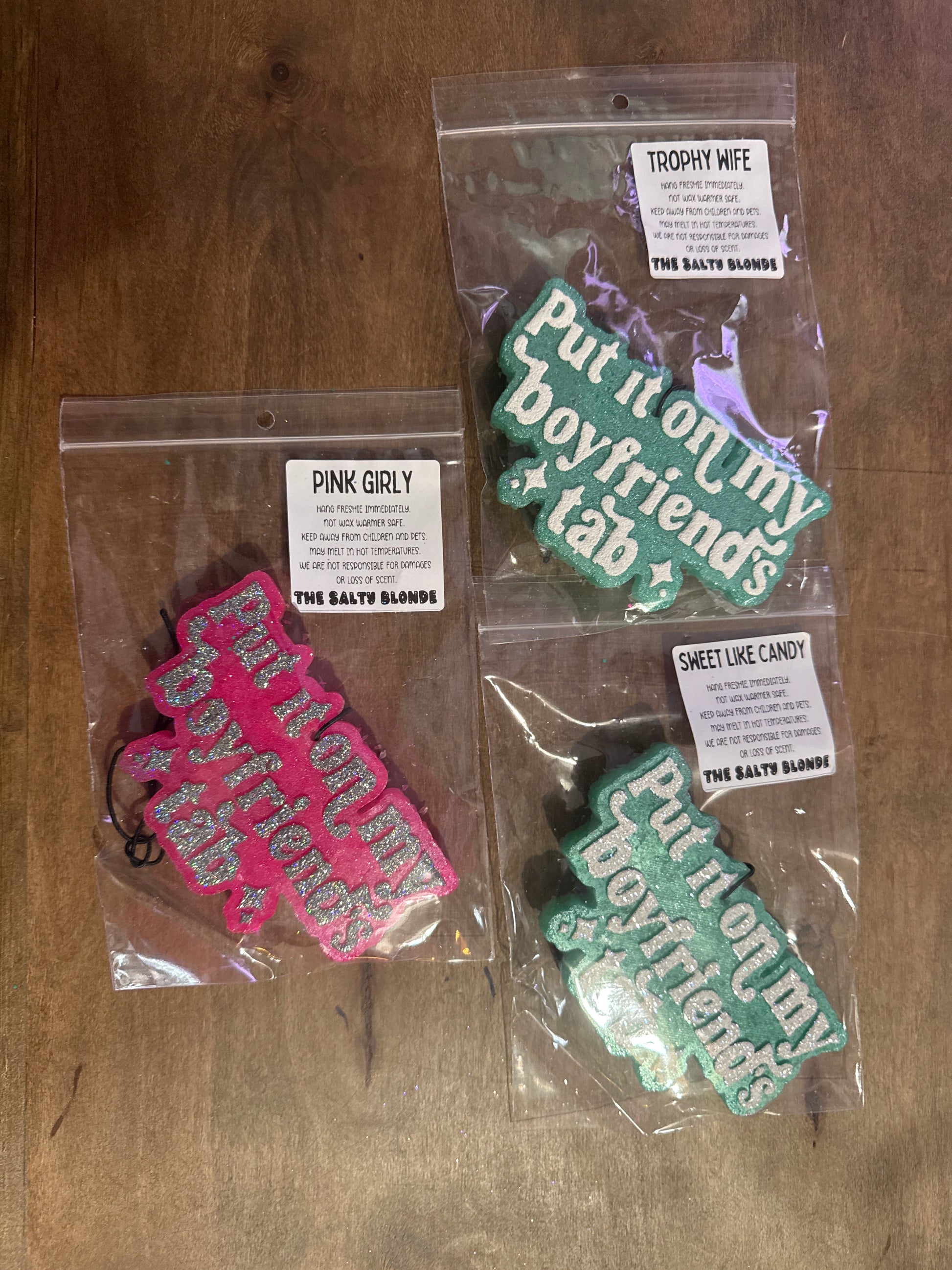 Experience the long-lasting, strong scent of Put It on My Boyfriends Tab Freshie! This car freshie will keep your vehicle smelling fresh and clean for days. Say goodbye to stale and musty odors, and hello to a invigorating and refreshing aroma. Upgrade your driving experience now!
