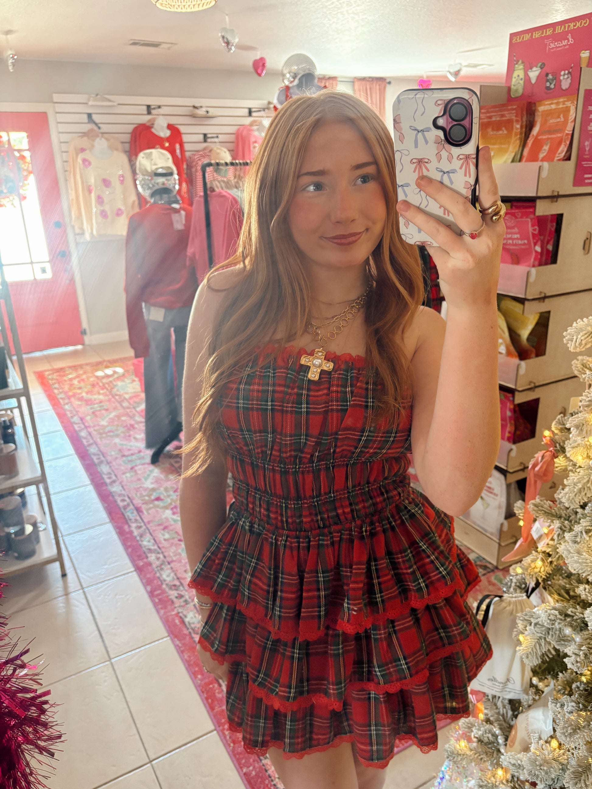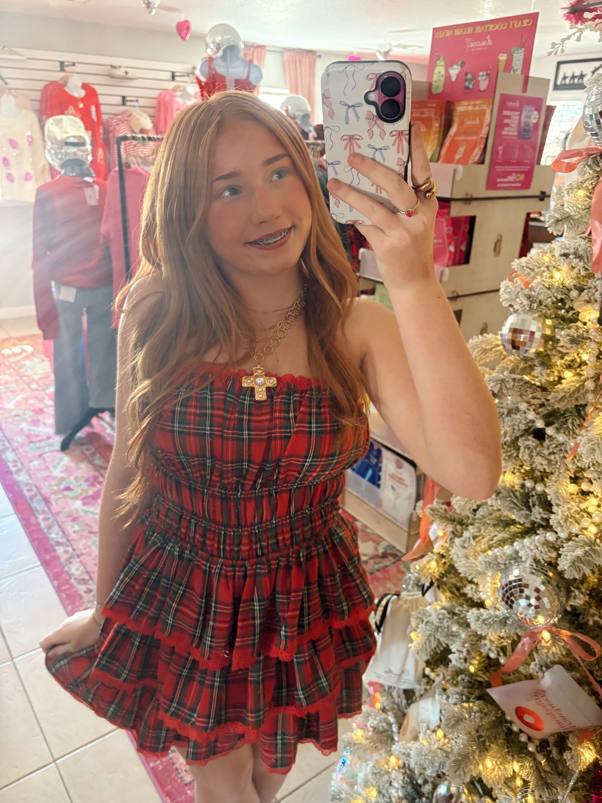 Embrace seasonal style with this elegant strapless tiered plaid mini romper. Featuring a sleek strapless bodice and thoughtfully layered tiers, this piece delivers understated sophistication with festive flair. The timeless plaid pattern adds visual interest while maintaining a refined aesthetic perfect for holiday parties, special events, or elevated casual occasions. The fitted waist and flowing skirt create a flattering silhouette that moves gracefully with you. Pair with metallic accessories and classic heels to complete a polished, memorable look.